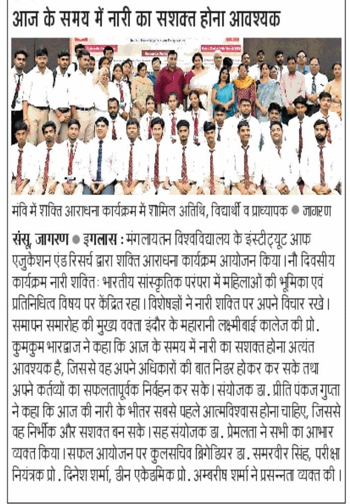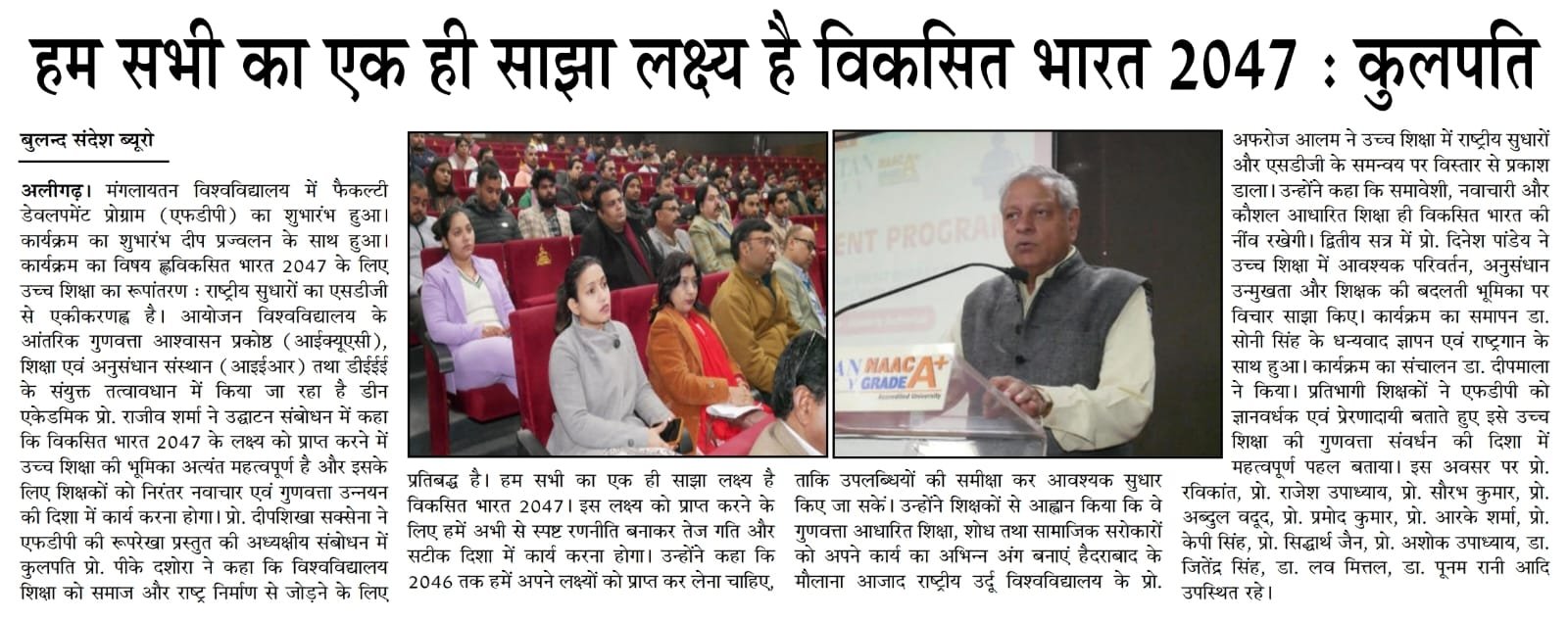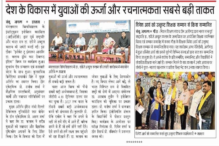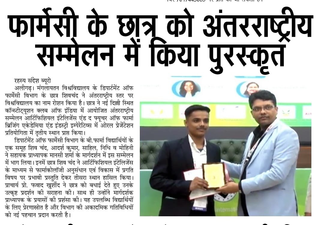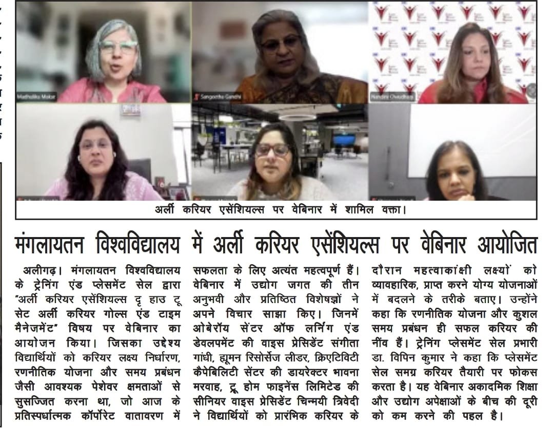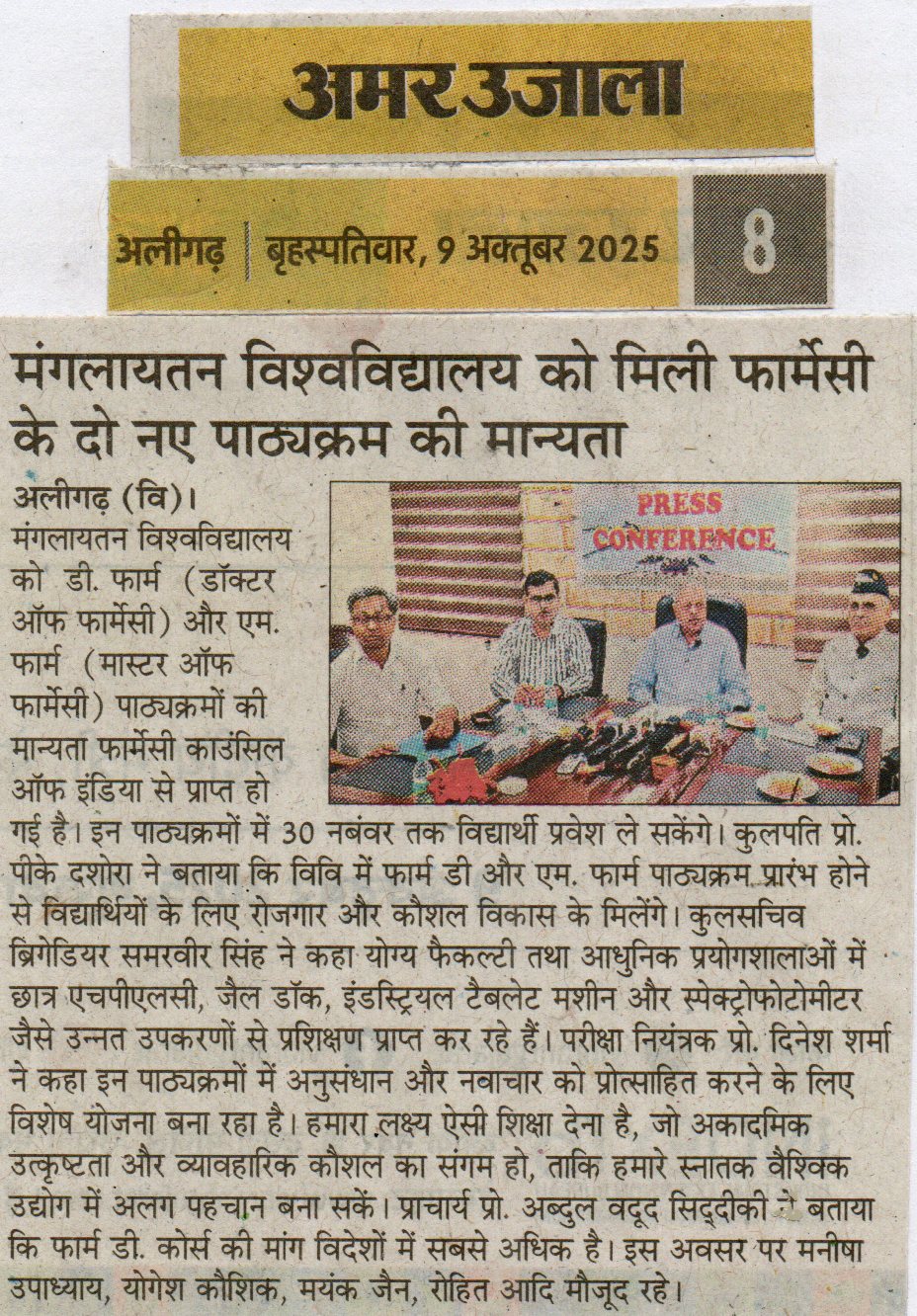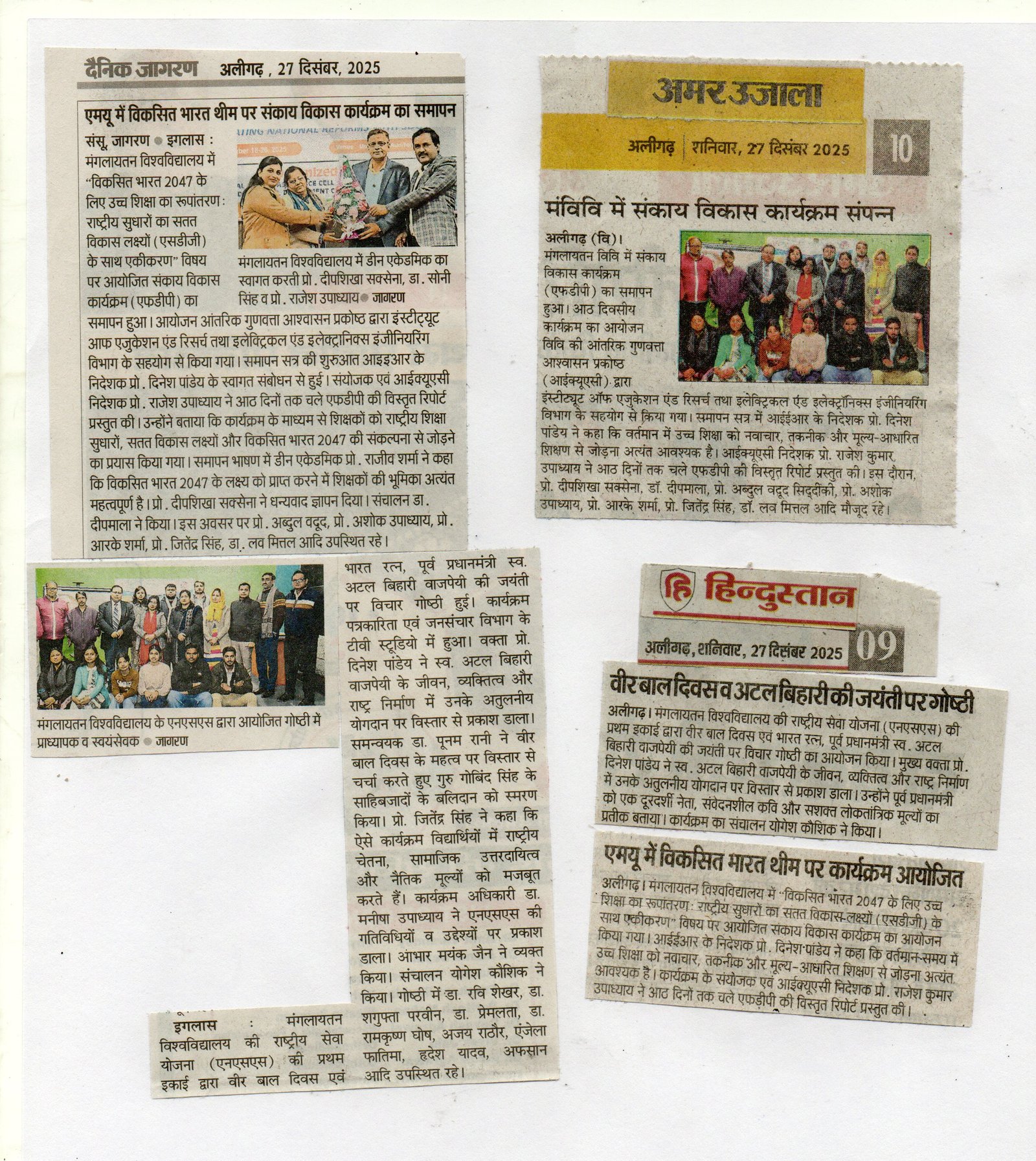 Mangalayatan University garnered significant attention in media with a feature highlighting departmental programs, community initiatives and activities. The article praised the university's commitment to academic excellence and its role in empowering academic units and their students through various skill development workshops and internships. Notably, the piece discussed the institution's efforts in promoting sustainable practices on campus, including eco-friendly initiatives that resonate with the university's mission to foster responsible citizens.This press clipping not only reflects the university's achievements but also its dedication to creating a vibrant learning environment, positioning Mangalayatan University as a cornerstone of educational development in the region. The coverage has sparked interest among prospective students and parents alike.