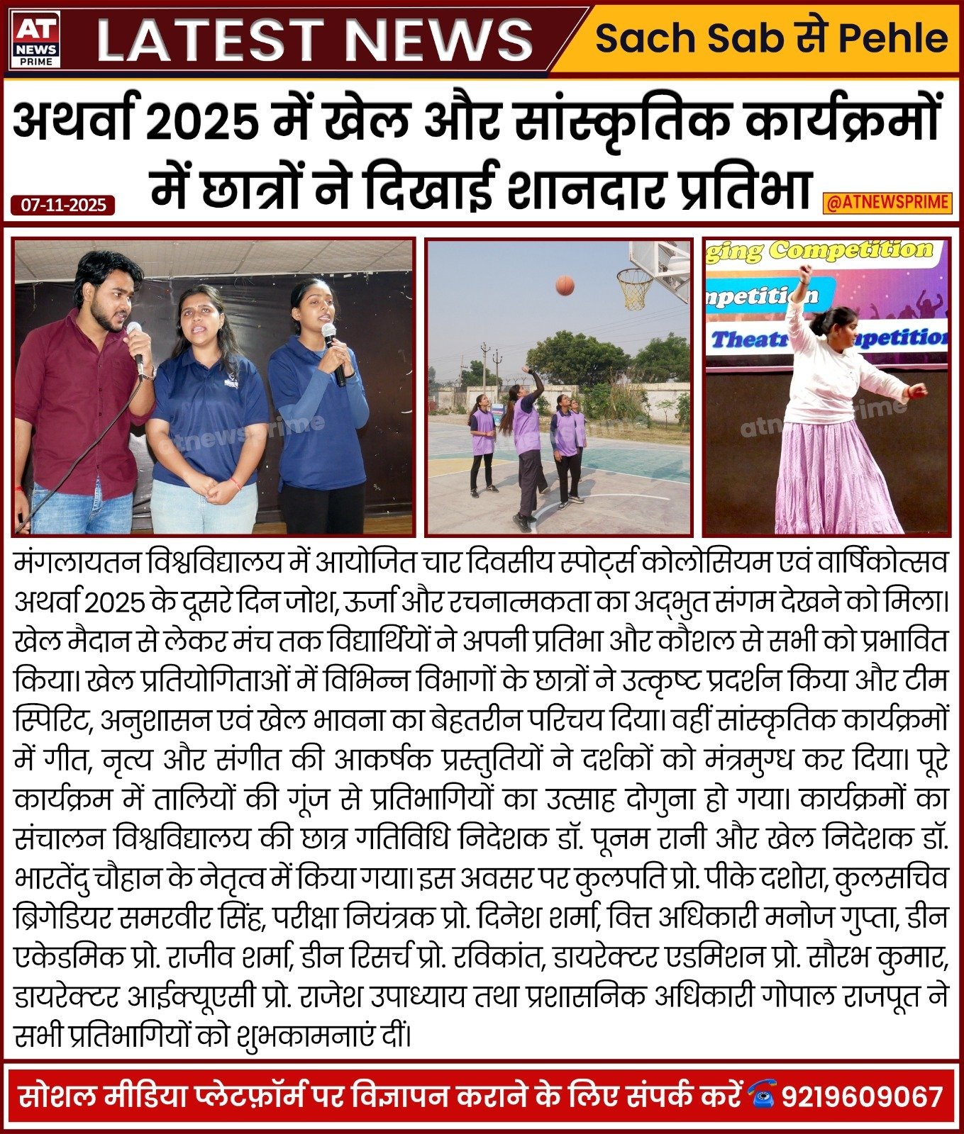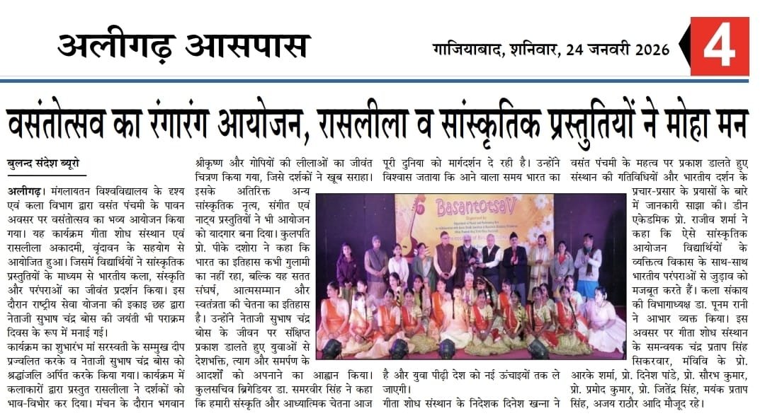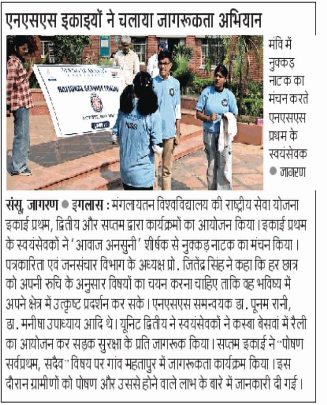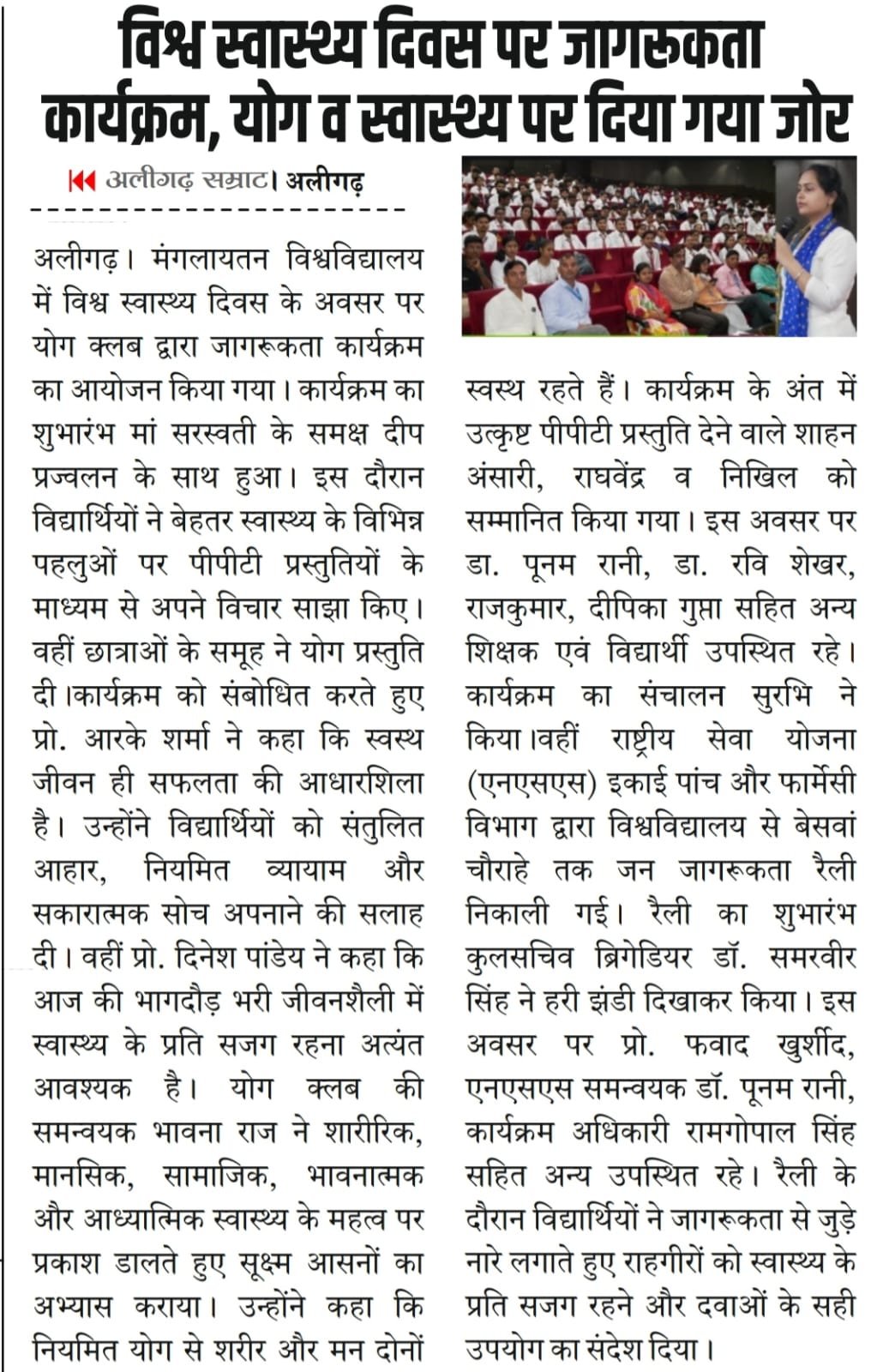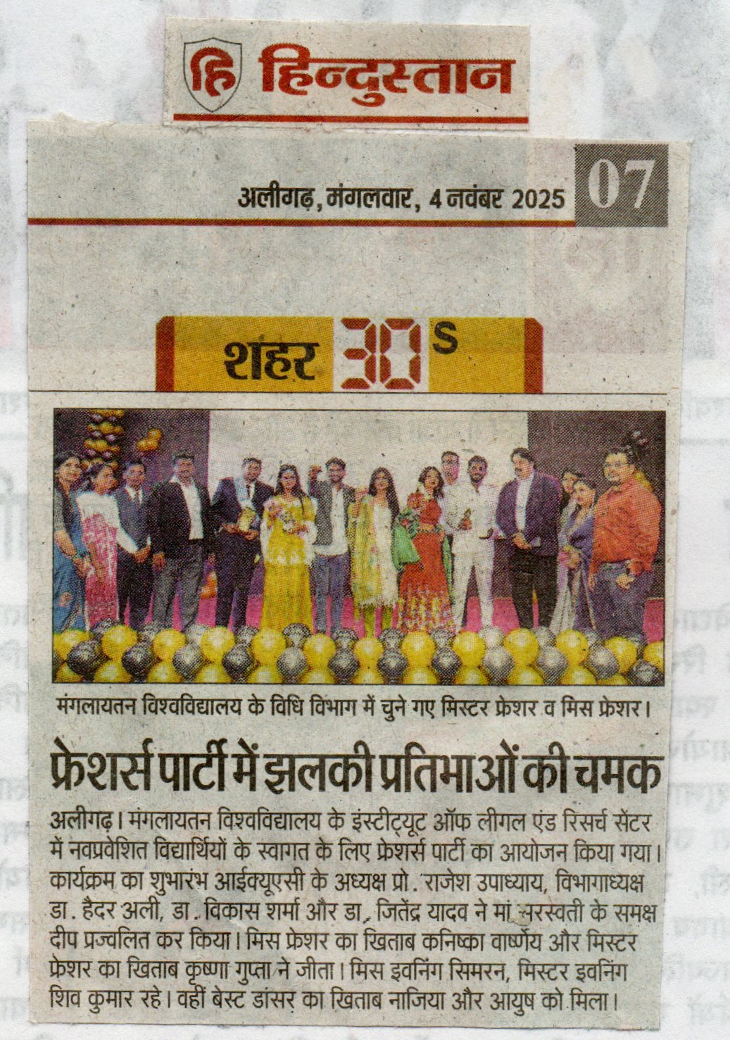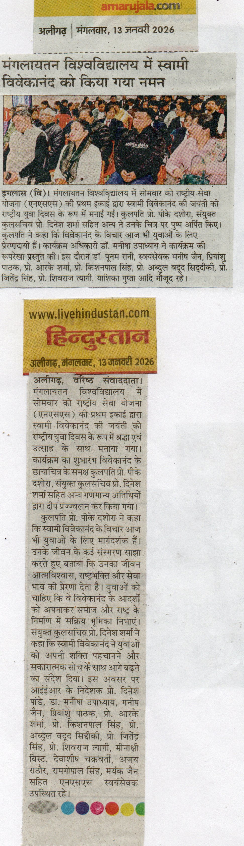 Mangalayatan University garnered significant attention in media with a feature highlighting departmental programs, community initiatives and activities. The article praised the university's commitment to academic excellence and its role in empowering academic units and their students through various skill development workshops and internships. Notably, the piece discussed the institution's efforts in promoting sustainable practices on campus, including eco-friendly initiatives that resonate with the university's mission to foster responsible citizens.This press clipping not only reflects the university's achievements but also its dedication to creating a vibrant learning environment, positioning Mangalayatan University as a cornerstone of educational development in the region. The coverage has sparked interest among prospective students and parents alike.