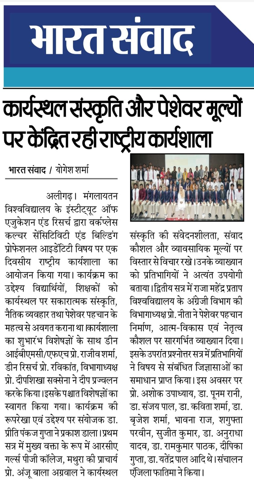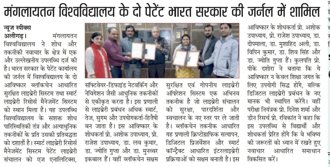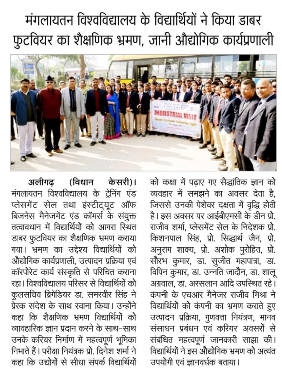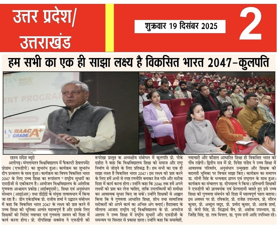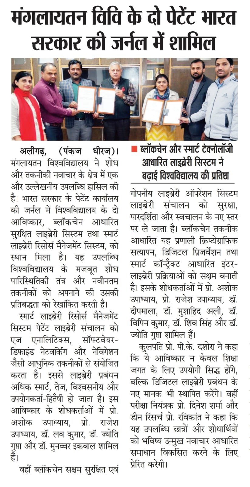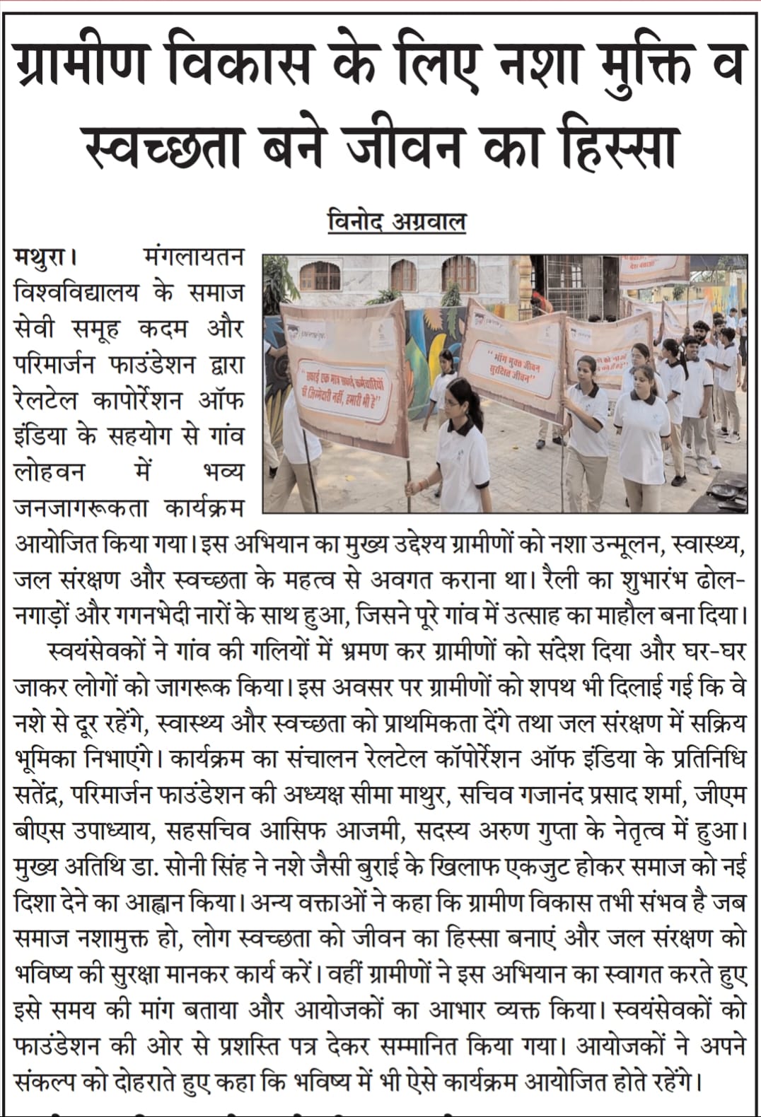 Mangalayatan University garnered significant attention in media with a feature highlighting departmental programs, community initiatives and activities. The article praised the university's commitment to academic excellence and its role in empowering academic units and their students through various skill development workshops and internships. Notably, the piece discussed the institution's efforts in promoting sustainable practices on campus, including eco-friendly initiatives that resonate with the university's mission to foster responsible citizens.This press clipping not only reflects the university's achievements but also its dedication to creating a vibrant learning environment, positioning Mangalayatan University as a cornerstone of educational development in the region. The coverage has sparked interest among prospective students and parents alike.