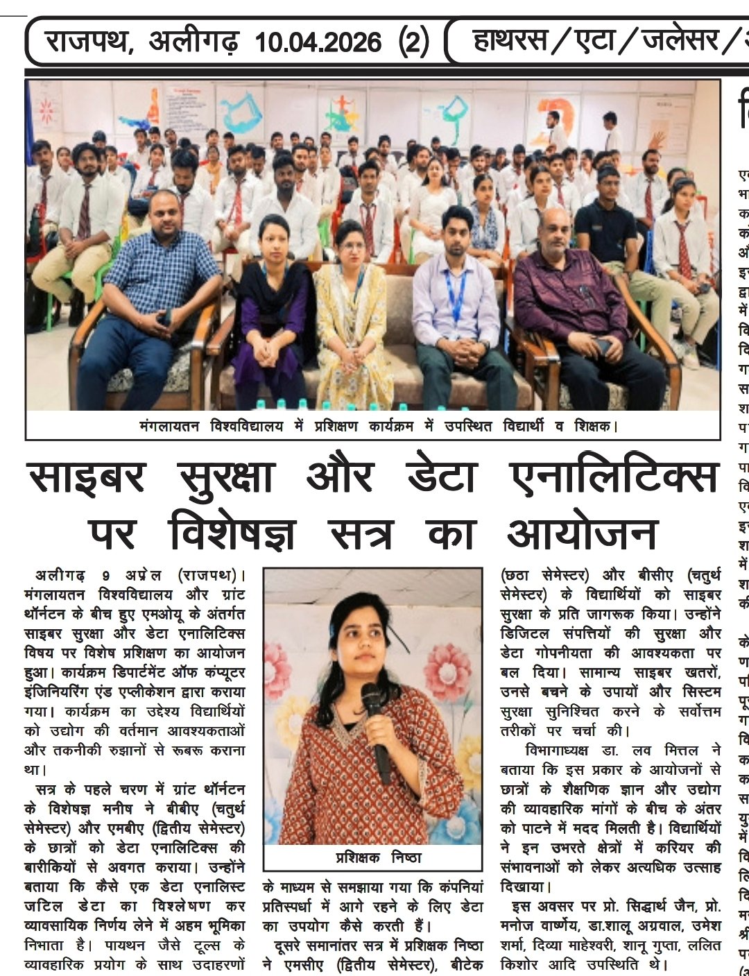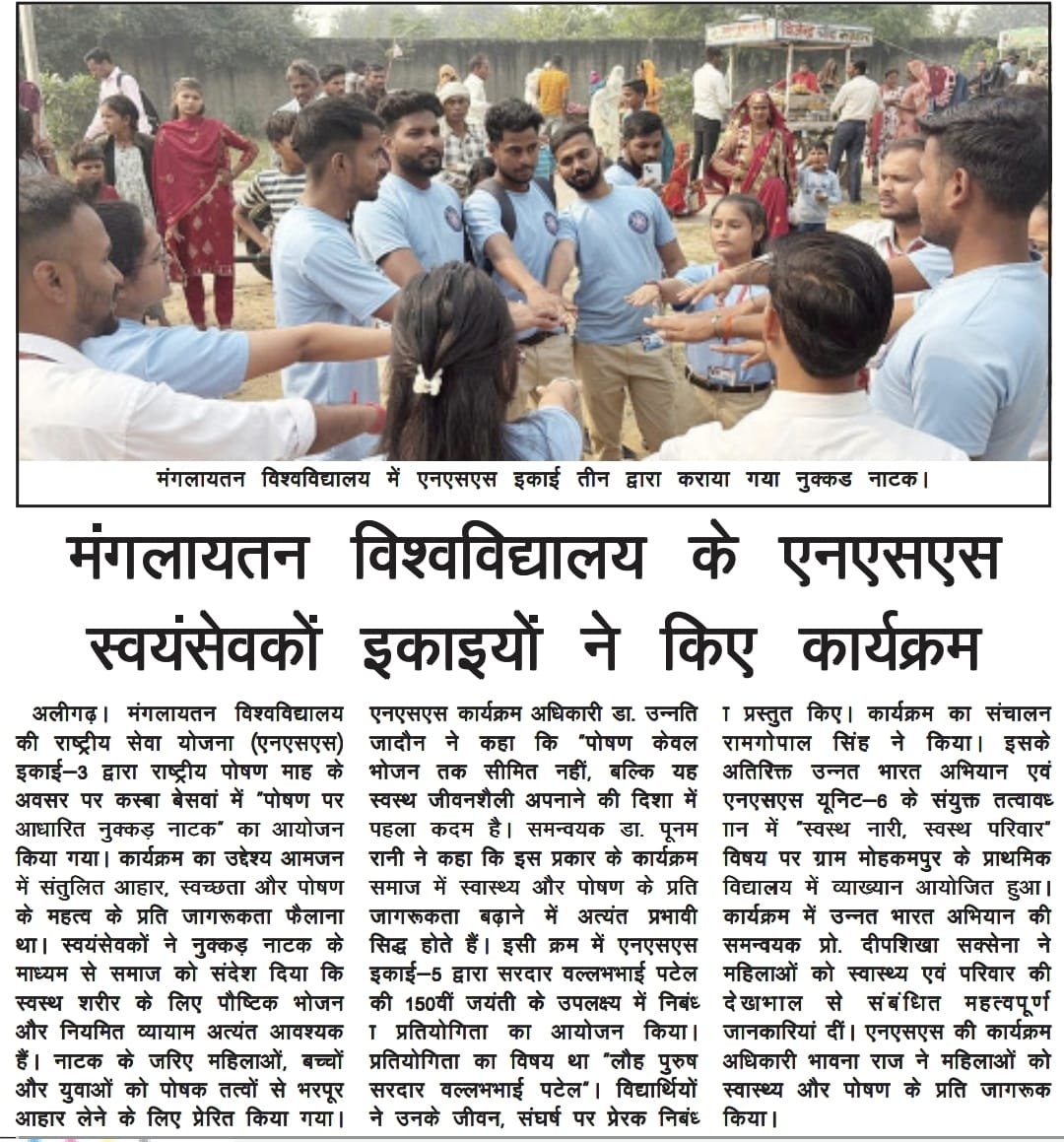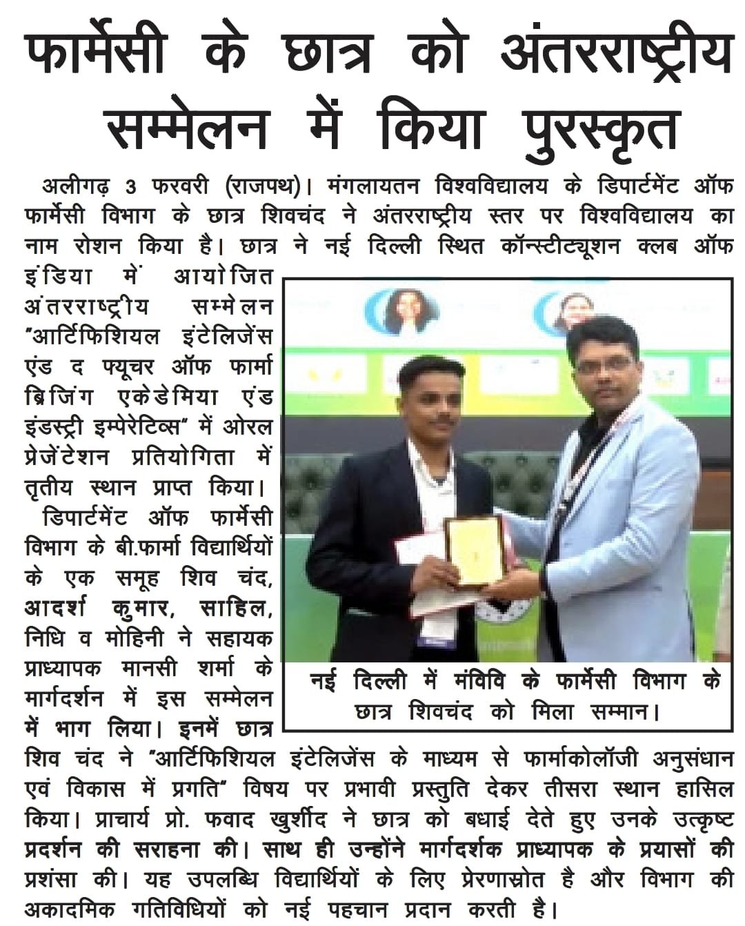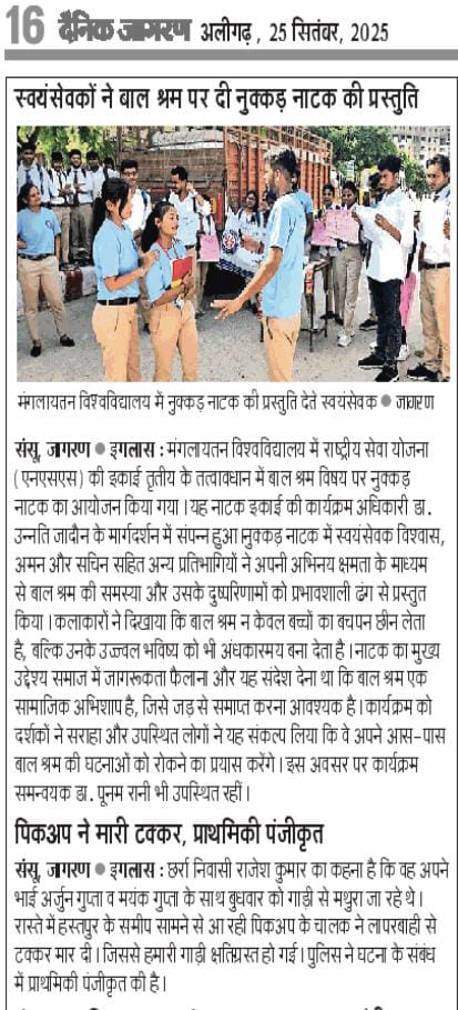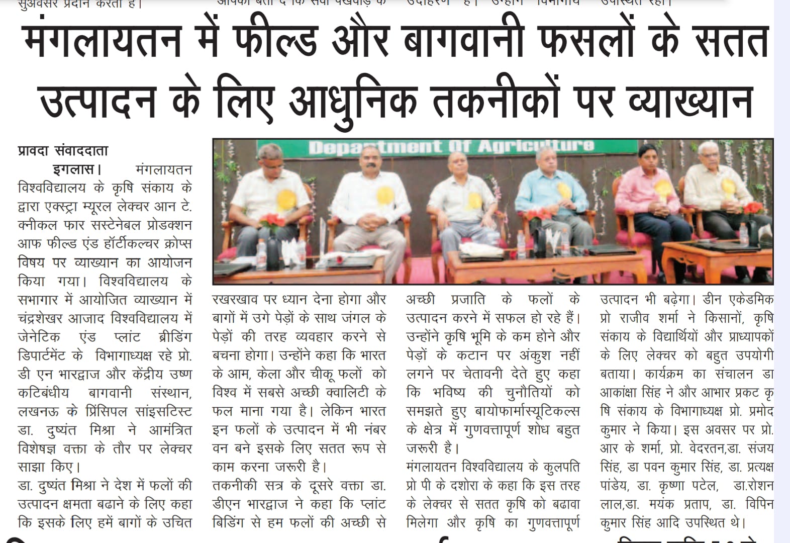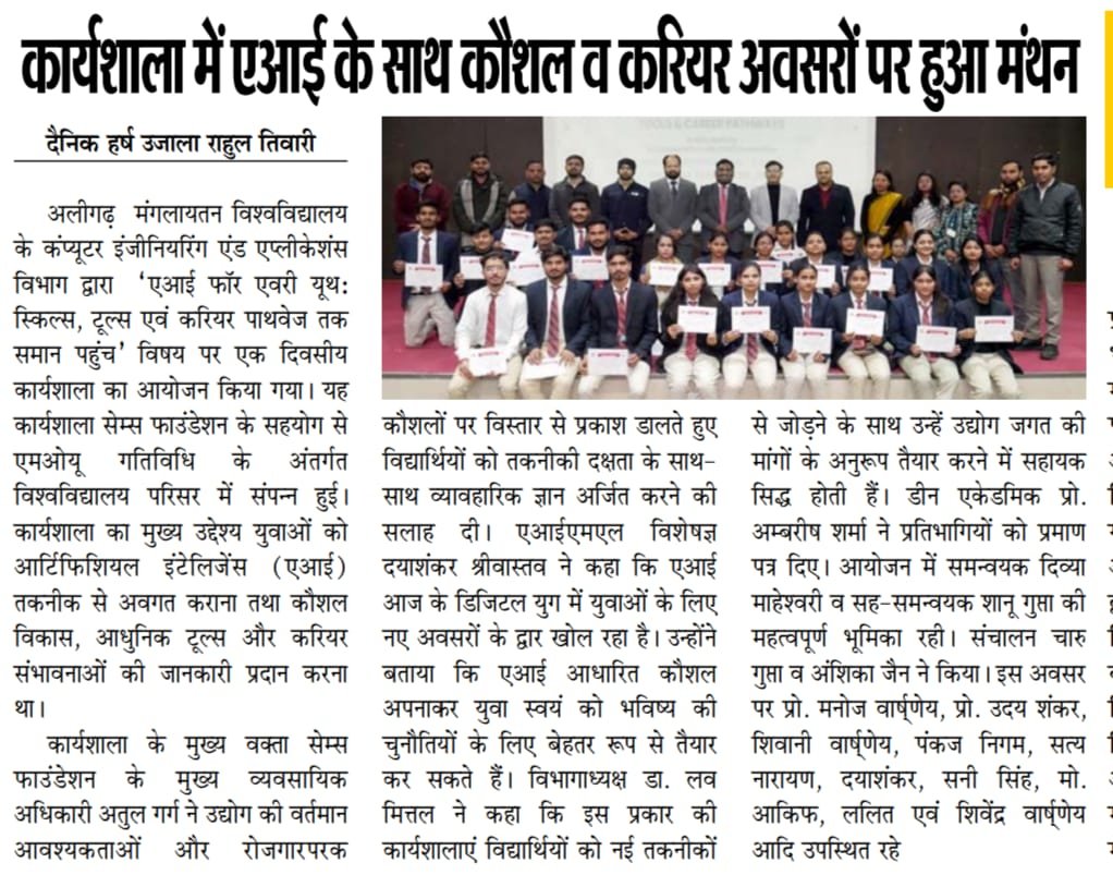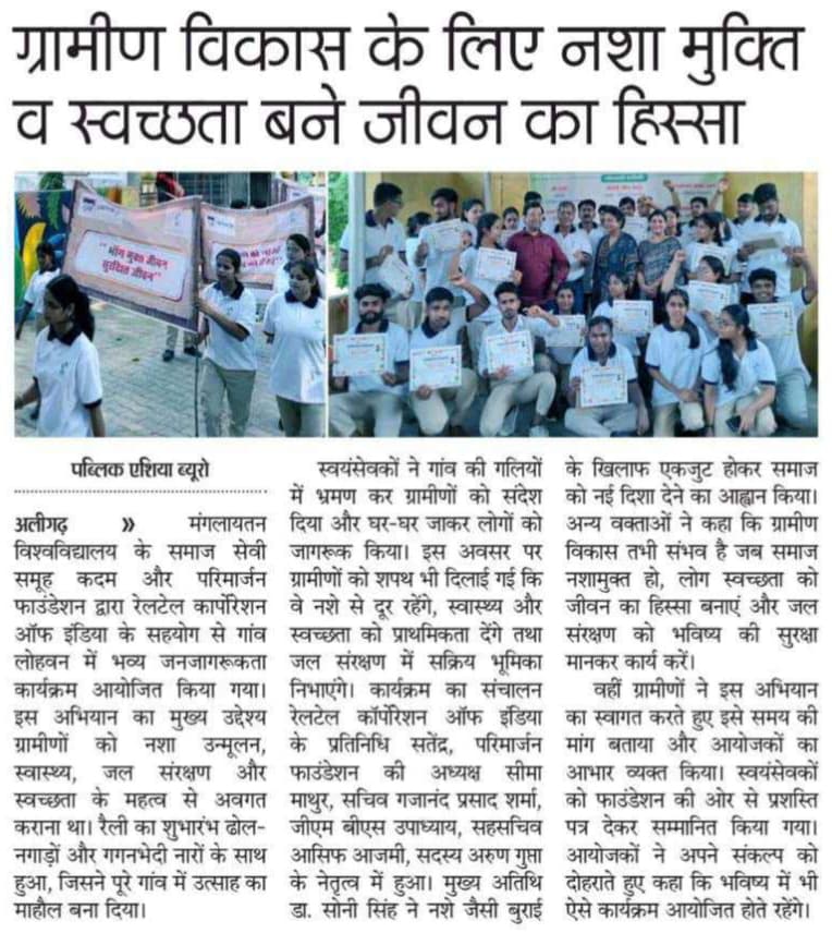 Mangalayatan University garnered significant attention in media with a feature highlighting departmental programs, community initiatives and activities. The article praised the university's commitment to academic excellence and its role in empowering academic units and their students through various skill development workshops and internships. Notably, the piece discussed the institution's efforts in promoting sustainable practices on campus, including eco-friendly initiatives that resonate with the university's mission to foster responsible citizens.This press clipping not only reflects the university's achievements but also its dedication to creating a vibrant learning environment, positioning Mangalayatan University as a cornerstone of educational development in the region. The coverage has sparked interest among prospective students and parents alike.
