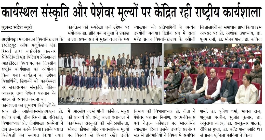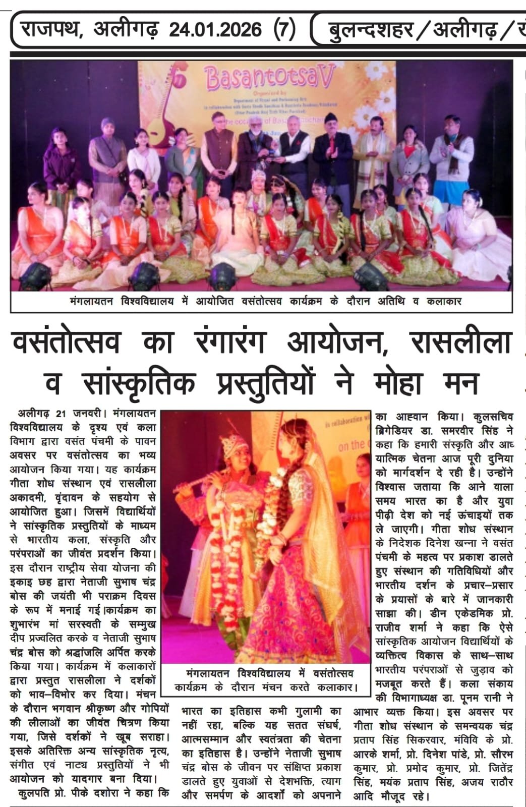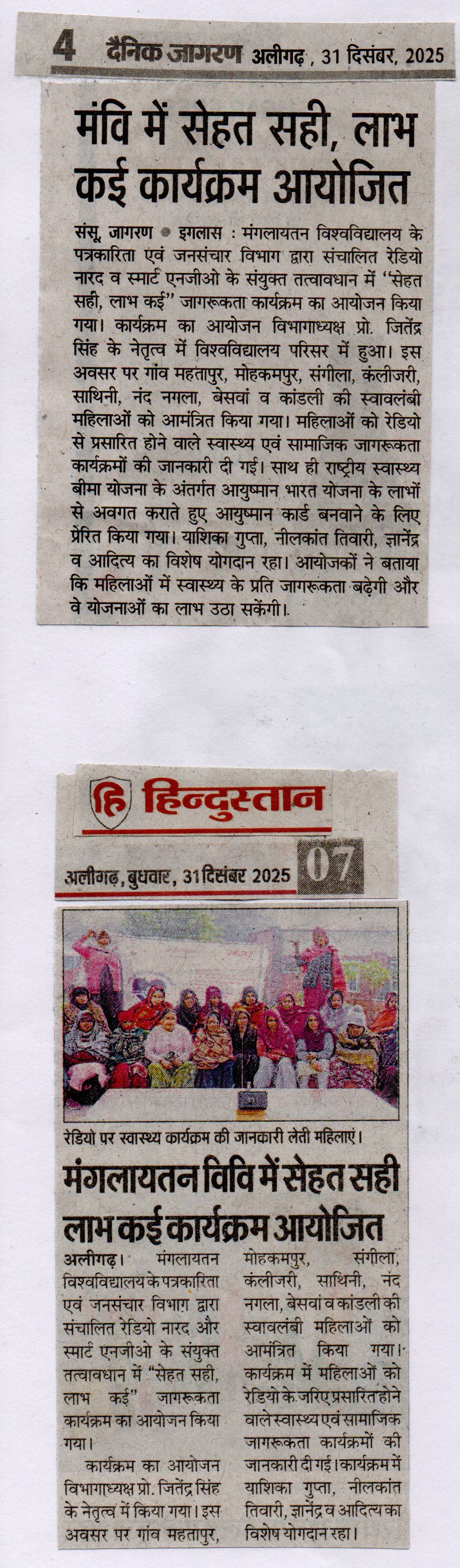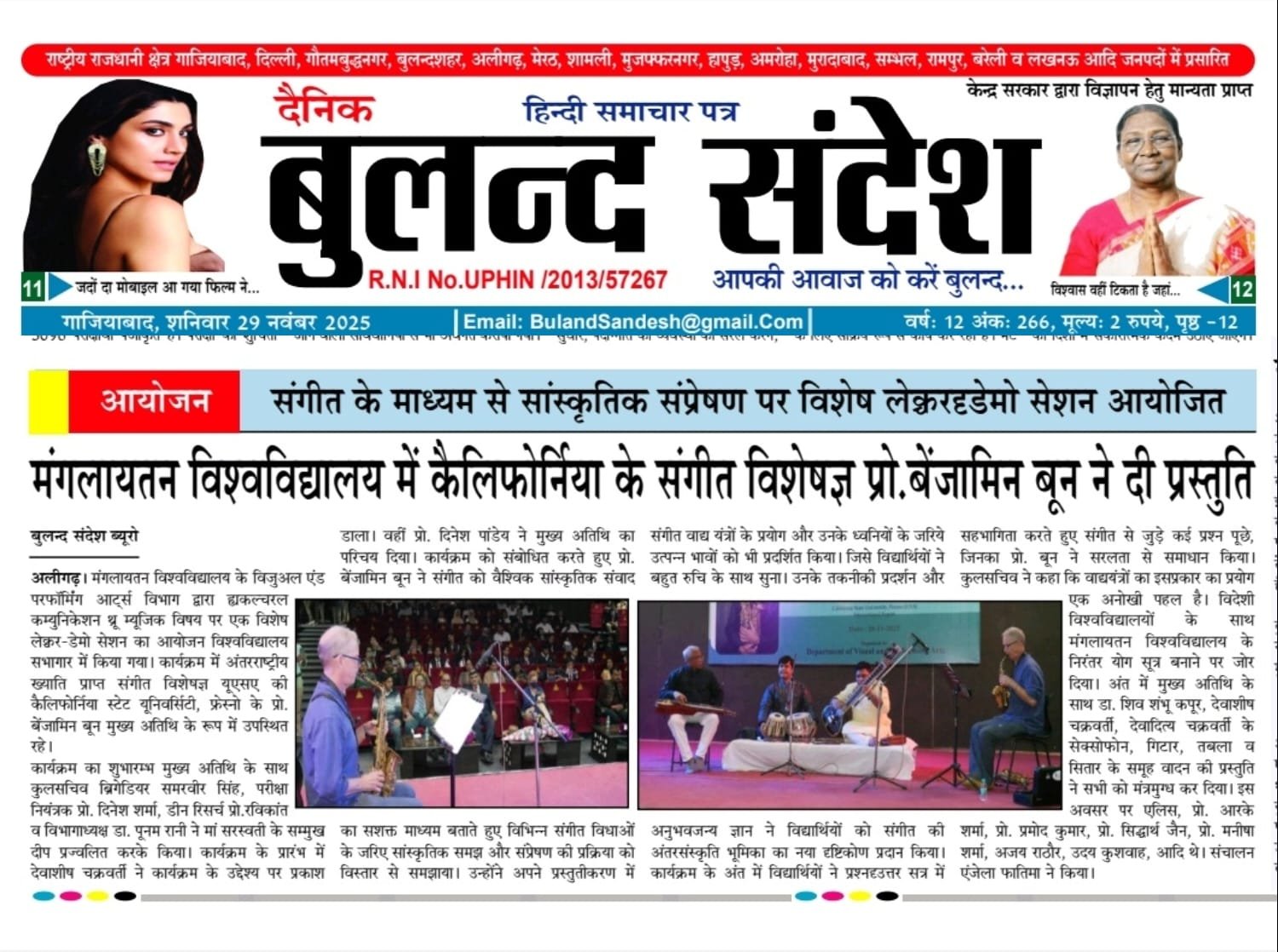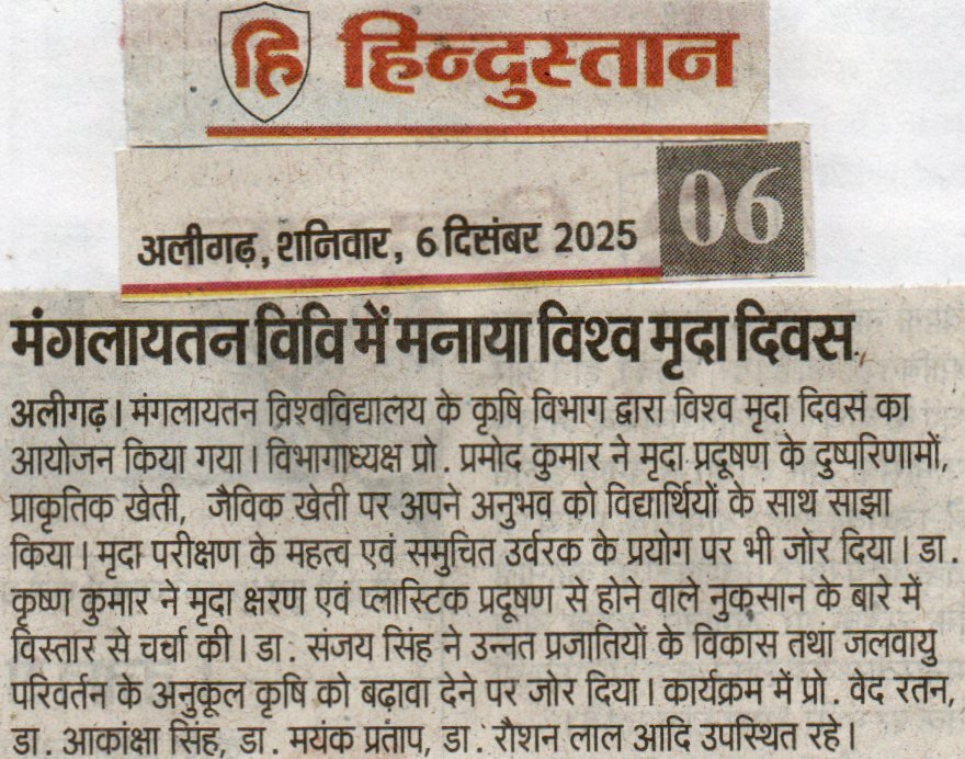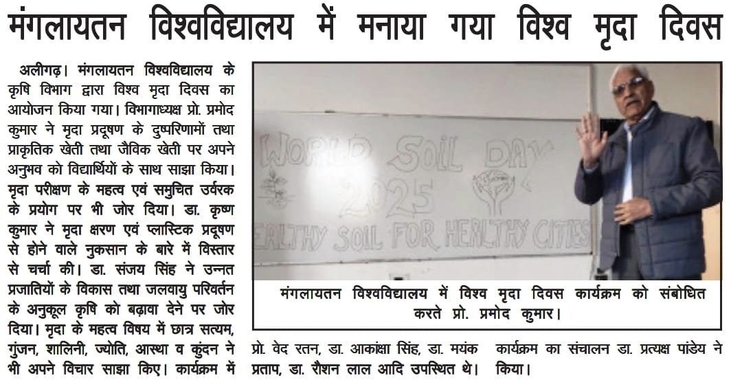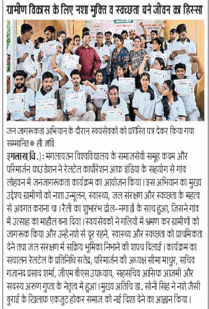Mangalayatan University garnered significant attention in media with a feature highlighting departmental programs, community initiatives and activities. The article praised the university's commitment to academic excellence and its role in empowering academic units and their students through various skill development workshops and internships. Notably, the piece discussed the institution's efforts in promoting sustainable practices on campus, including eco-friendly initiatives that resonate with the university's mission to foster responsible citizens.This press clipping not only reflects the university's achievements but also its dedication to creating a vibrant learning environment, positioning Mangalayatan University as a cornerstone of educational development in the region. The coverage has sparked interest among prospective students and parents alike.