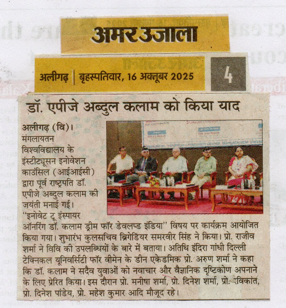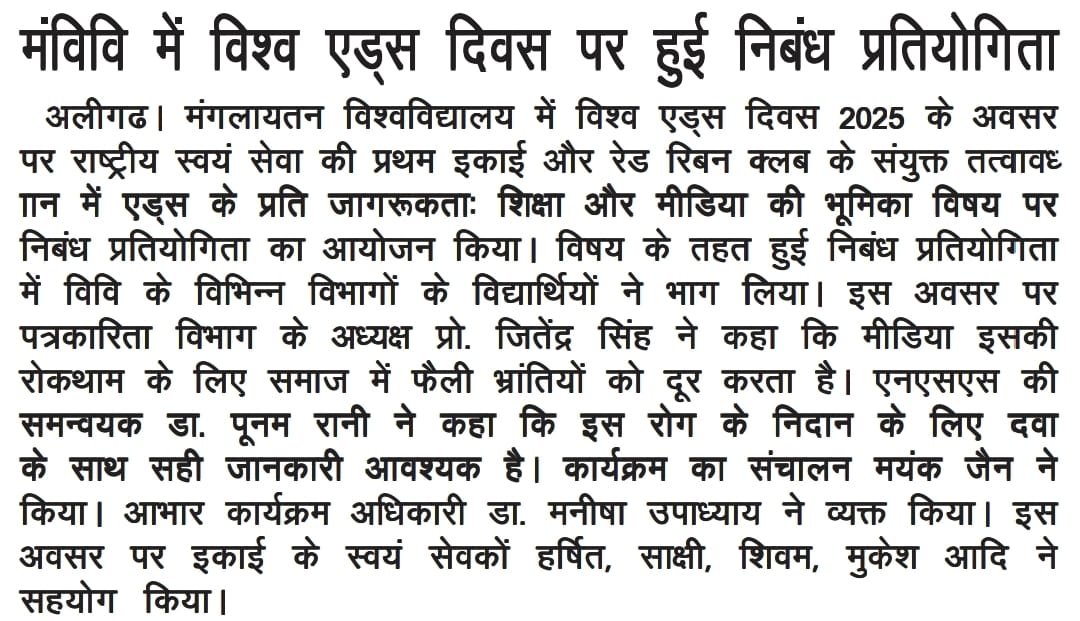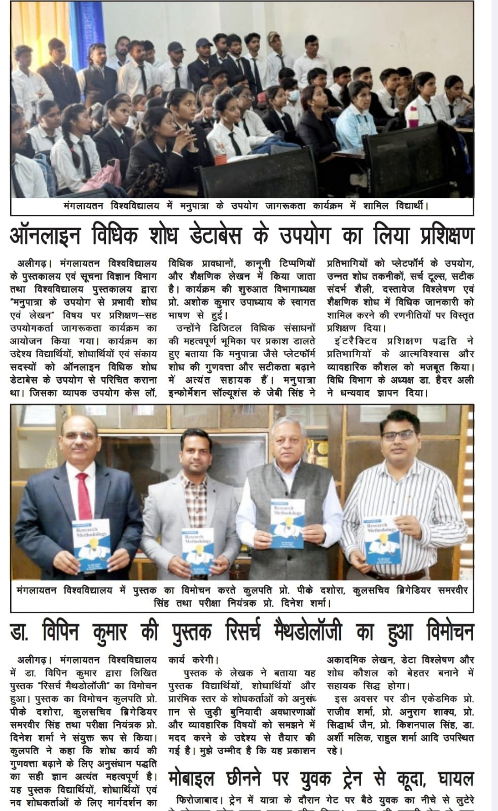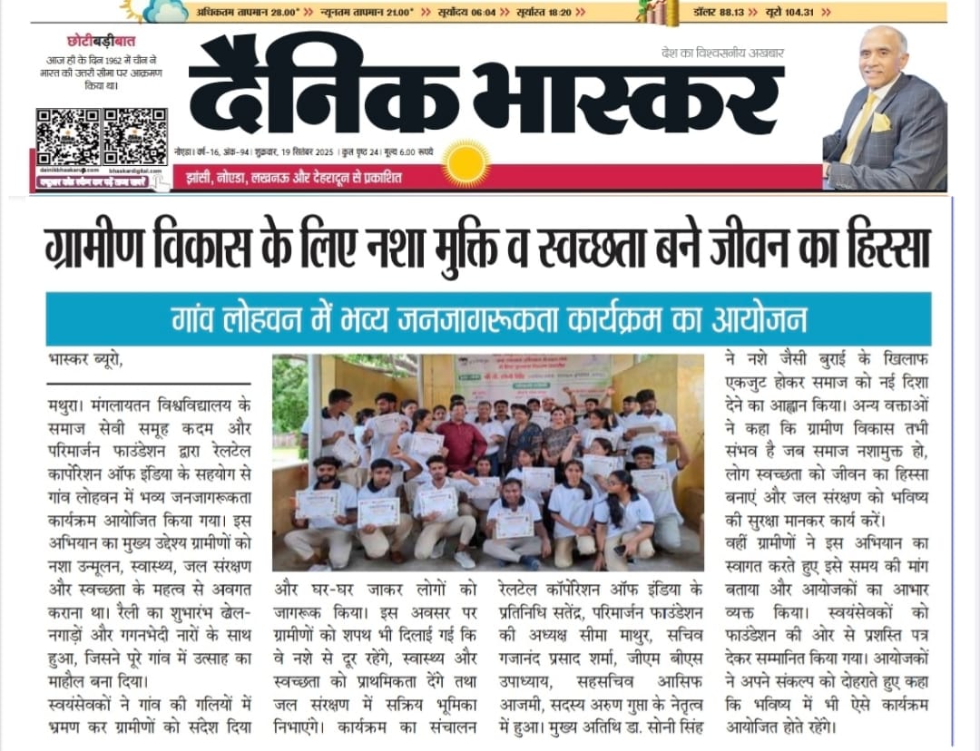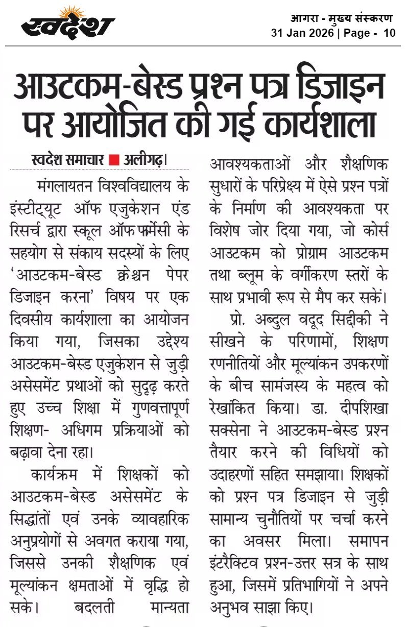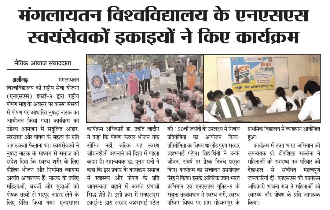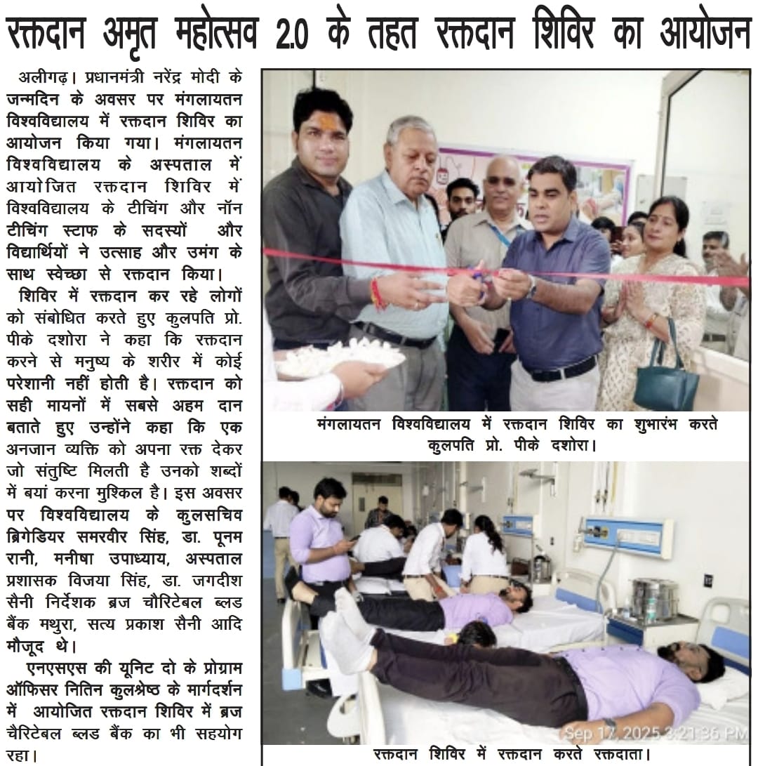 Mangalayatan University garnered significant attention in media with a feature highlighting departmental programs, community initiatives and activities. The article praised the university's commitment to academic excellence and its role in empowering academic units and their students through various skill development workshops and internships. Notably, the piece discussed the institution's efforts in promoting sustainable practices on campus, including eco-friendly initiatives that resonate with the university's mission to foster responsible citizens.This press clipping not only reflects the university's achievements but also its dedication to creating a vibrant learning environment, positioning Mangalayatan University as a cornerstone of educational development in the region. The coverage has sparked interest among prospective students and parents alike.